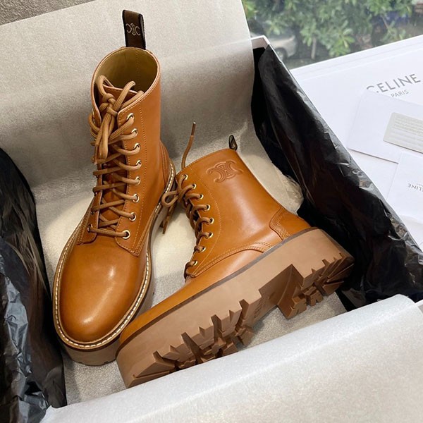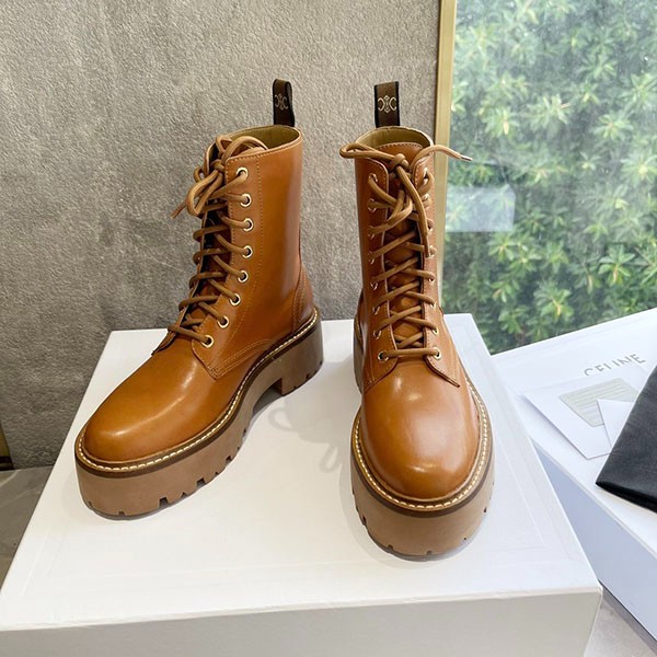 セリーヌ 偽物 バルキー レースアップ ブーツ / カーフスキン / タン Cex84479