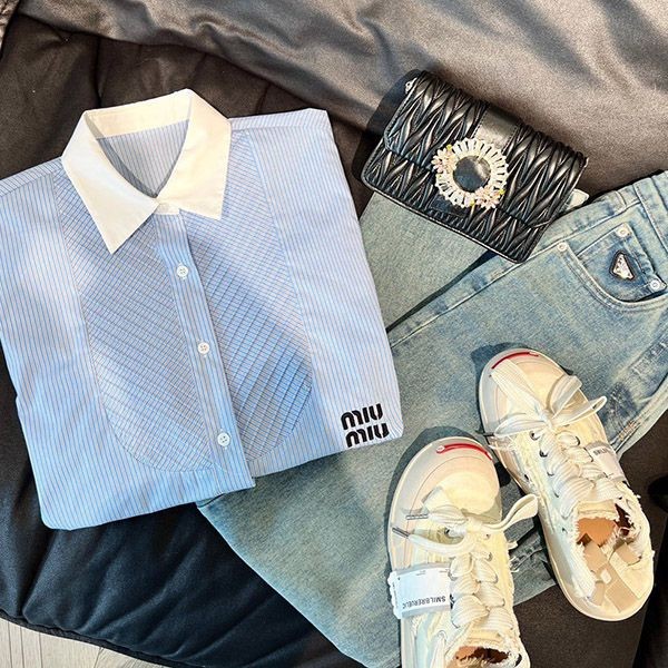 完売必至 ミュウミュウ ロゴストライプシャンブレー シャツ 偽物 myd23368