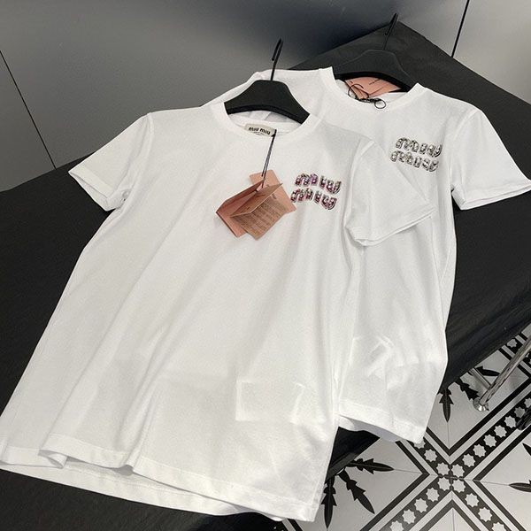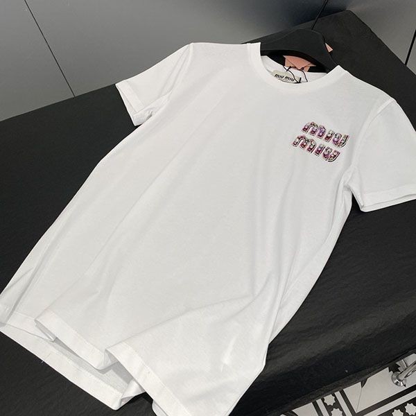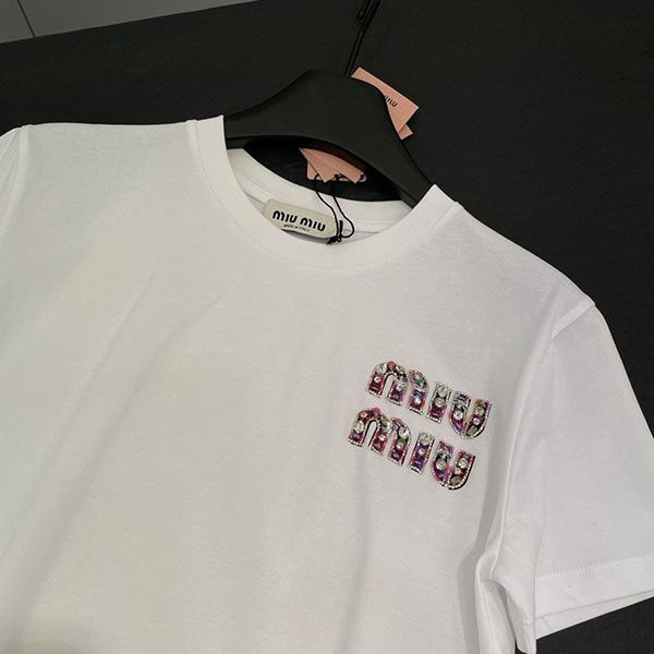 即発送 ミュウミュウ 刺繍入りコットンTシャツ 偽物 myf59063
