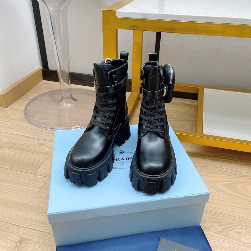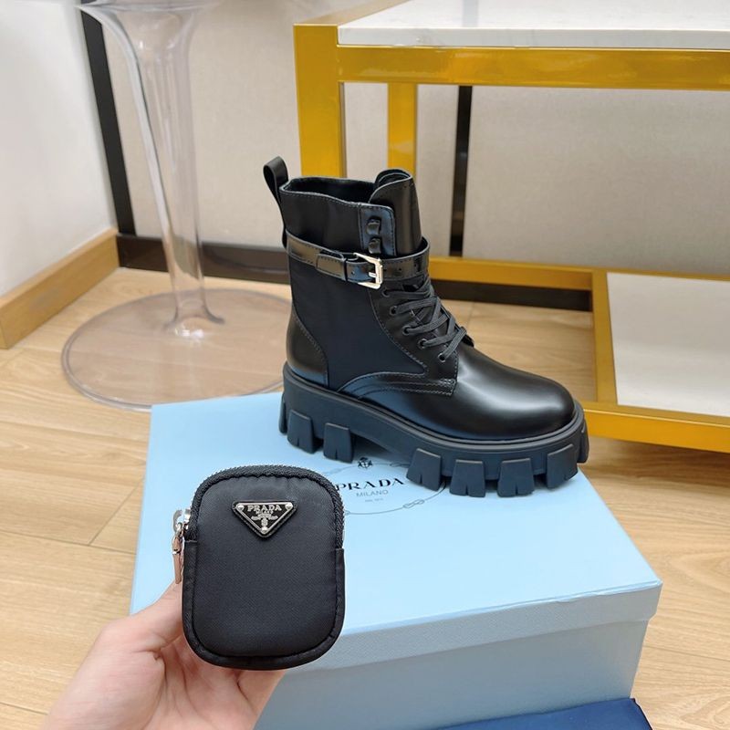 超話題!プラダ モノリス 偽物 ブラッシュドレザーxナイロン コンバットブーツ pur30762